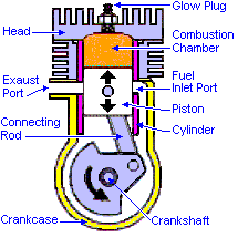While the piston moves up, the mixture is compressed and when the piston reaches the top, the glow plug ignites the compressed gases, forcing the piston down (2nd stroke).